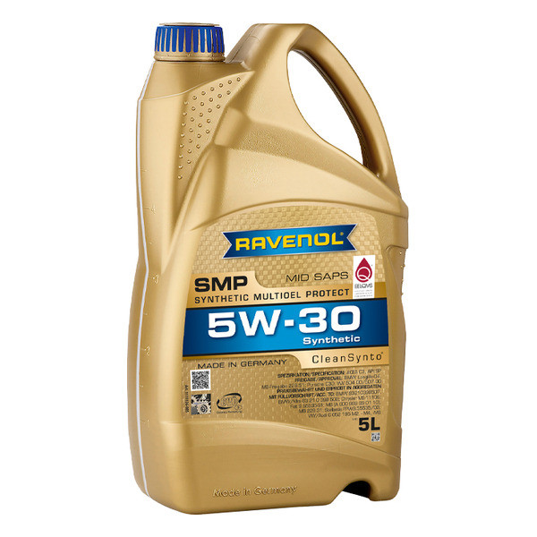 RAVENOL SMP SAE 5W-30 - синтетическое легкотекучее среднезольное (MID SAPS) моторное масло, изготовленное с применением технологии CleanSynto® для легковых бензиновых и дизельных моторов с и без турбонаддува и прямым впрыском топлива. Минимизирует трение, износ, сокращает расход топлива, обеспечивает прекрасные свойства при холодном старте. Удлиненные интервалы замены согласно требованиям автопроизводителей.